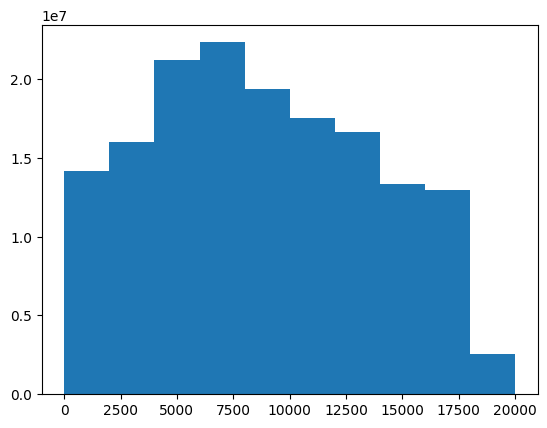 plt.hist(each_location.D[each_location.D>0])(array([14176290., 16005894., 21186674., 22331128., 19394182., 17548252.,