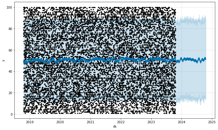 forecast = model.predict(future)365일 날짜를 생성해서 분석 수행하도록 periods를 365로 넣음
