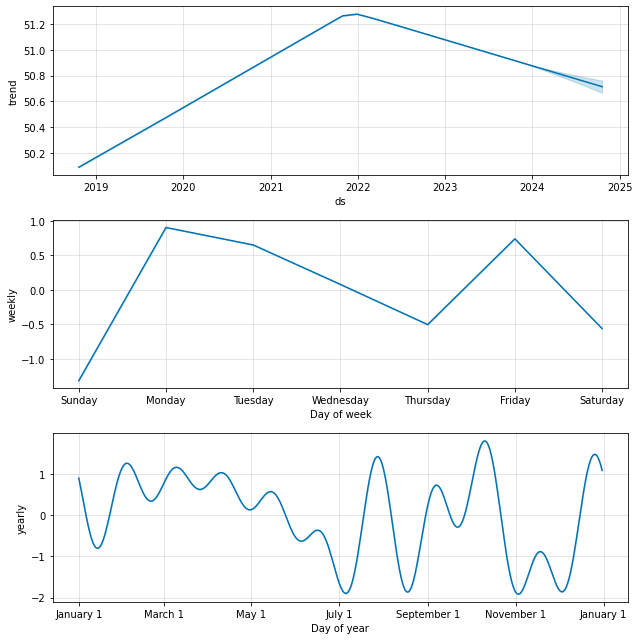 forecast.head()| ds | trend | yhat_lower | yhat_upper | trend_lower | trend_upper | additive_terms | additive_terms_lower | additive_terms_upper | weekly | weekly_lower | weekly_upper | yearly | yearly_lower | yearly_upper | multiplicative_terms | multiplicative_terms_lower | multiplicative_terms_upper | yhat | |
