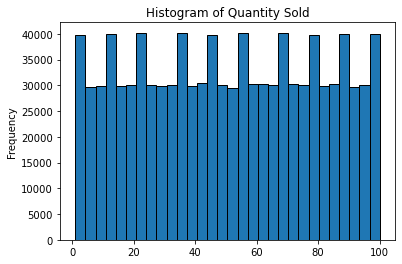 df_pharmacy_sales['Quantity Sold'].plot.hist(bins=30,edgecolor='k')