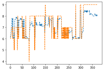 plt.plot(df[df['BMI Category'] != 'Obese']['Quality of Sleep'],'--')