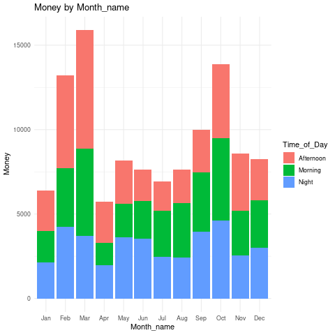ggplot(df, aes(x = Month_name, y = money, fill = Time_of_Day)) +