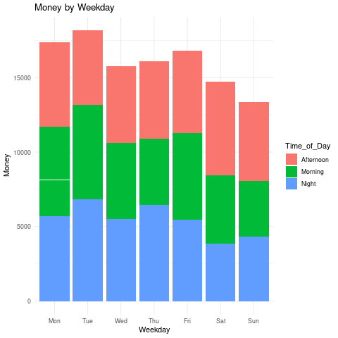 ggplot(df, aes(x = Weekday, y = money, fill = Time_of_Day)) +