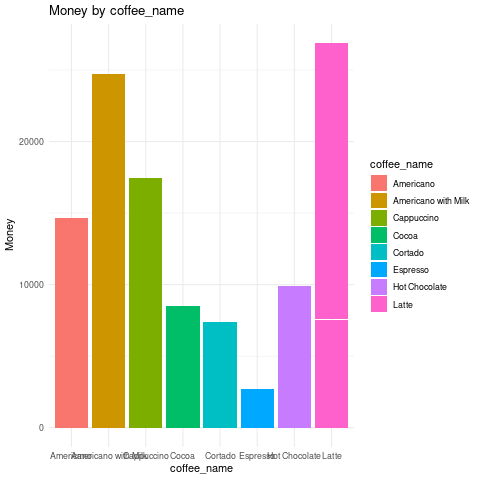 ggplot(df, aes(x = coffee_name, y = money, fill = coffee_name)) +
