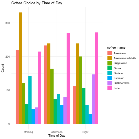 labs(title = "Coffee Choice by Time of Day", x = "Time of Day", y = "Count") +