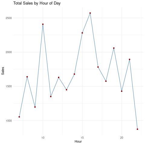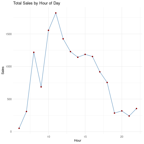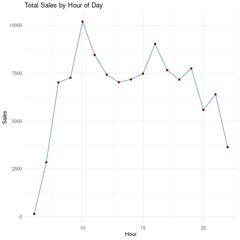 labs(title = "Total Sales by Hour of Day", x = "Hour", y = "Sales") +