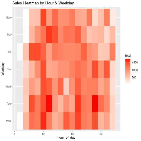 labs(title = "Sales Heatmap by Hour & Weekday")`summarise()` has grouped output by 'Weekday'. You can override using the