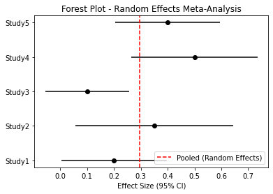 print(f"95% CI for r: [{r_low:.3f}, {r_high:.3f}]")Random-Effects Meta-Analysis (DerSimonian–Laird)