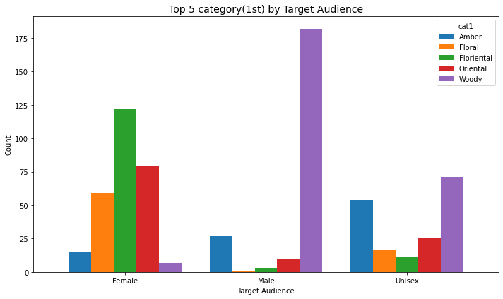 plt.title("Top 5 category(1st) by Target Audience", fontsize=14)