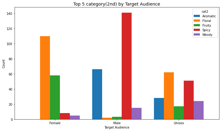 counts = df_top5.groupby(["target_audience", "cat2"]).size().reset_index(name="count")bar chart