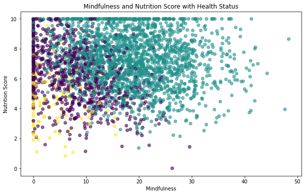 plt.title('Mindfulness and Nutrition Score with Health Status')Text(0.5, 1.0, 'Mindfulness and Nutrition Score with Health Status')