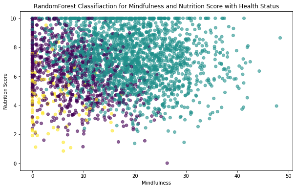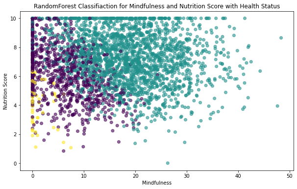 plt.title('RandomForest Classifiaction for Mindfulness and Nutrition Score with Health Status')Text(0.5, 1.0, 'RandomForest Classifiaction for Mindfulness and Nutrition Score with Health Status')